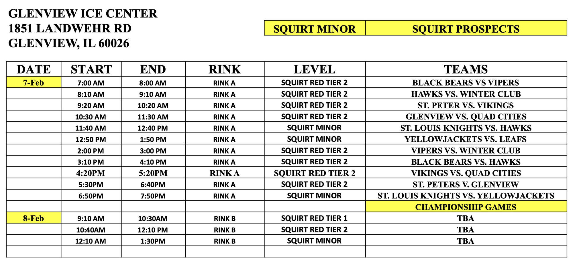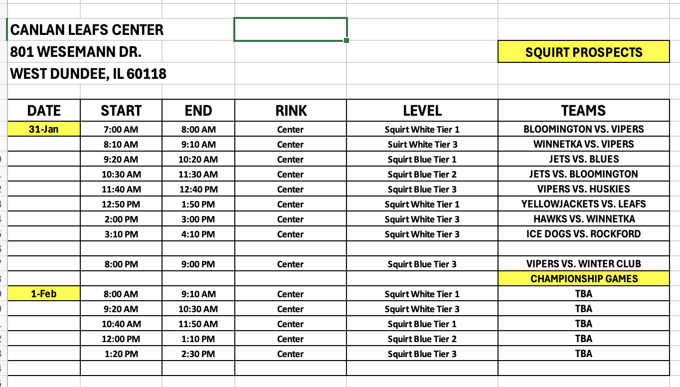 | SQUIRT PROSPECTS | 12 MIN | 1:30 MIN | 5 MIN 3 ON 3 | 1 HR | 2 |