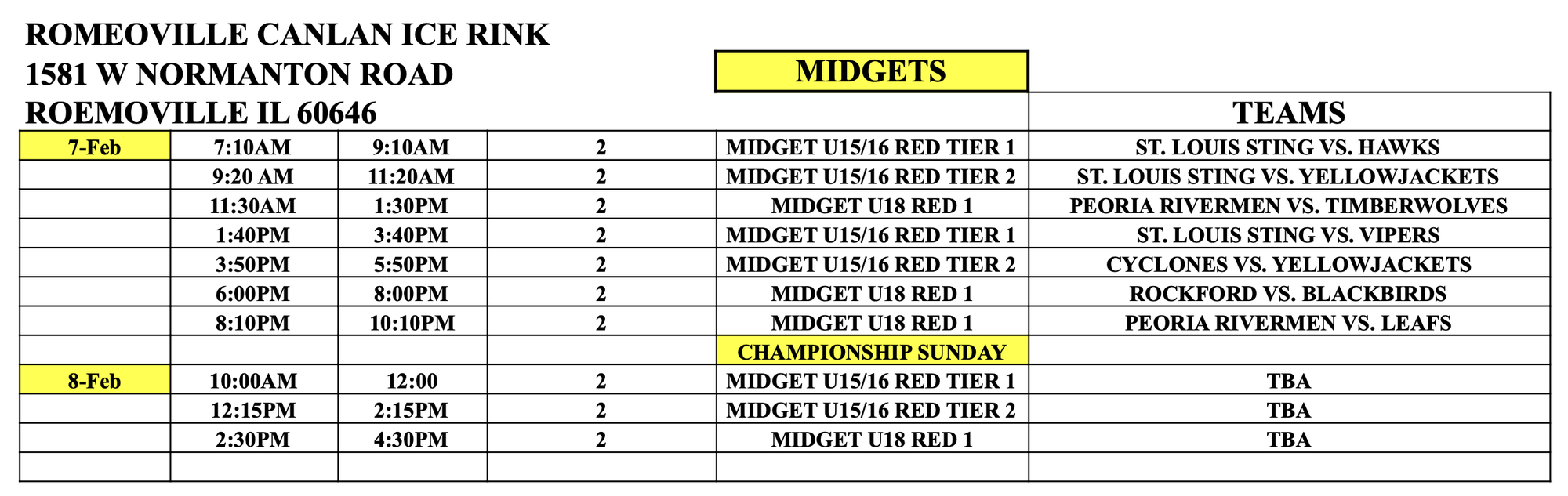 | MIDGET PROSPECT U16/U16 | 16 MIN | 2 MIN | 5 MIN 3 ON 3 | 1 HR 40 MIN | 3 |